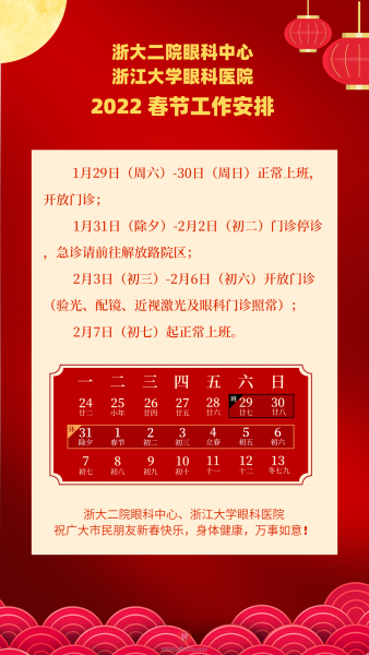 ****眼科中心**眼科医院春节放假时间工作安排 杭城看牙记 • 2022年1月24日 15:59 • 杭州看牙动态 浙江**第二**中心是一所集医疗、教学、科研为一体的现代化眼科中心。 医院地址:杭州市上城区西湖大道1号(地铁1号、5号线“城站”站下车,D出口即达)。 本文内容源自网络仅供参考,不作为诊断医疗依据,更多查询请 → 在线咨询客服