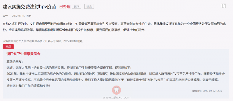浙江或将全省女性HPV疫苗免费接种 杭城看牙记 • 2022年3月8日 07:53 • 杭州本地最新 2022年政府工作报告指出,切实保障和改善民生,提高医疗卫生服务能力。同时还指出,坚持预防为主,深入推进健康中国行动。 近年来,宫颈癌呈发病率上升、发病年轻化的特征,严重威胁女性群体的生命健康。而接种HPV疫苗是预防宫颈癌的有效措施之一,为此,我国多地部署开展适龄女性HPV疫苗免费接种工作。 日前,浙江省卫健委回复网友提问时表示,不排除今后全省范围内实施免费接种。 本文内容源自网络仅供参考,不作为诊断医疗依据,更多查询请 → 在线咨询客服
