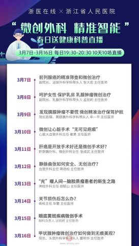 在这春暖花开之际,都市快报联合浙江省**,推出“春日送健康”大型科普直播活动。3月7日-16日,连续10天10场直播,以“微创外科,精准智能”为主题,医院十大王牌科室——头颈外科、泌尿外科、乳腺外科、胃肠胰外科、肝胆胰外科、血管外科、心脏大血管外科、神经外科、骨科、眼科联袂参与,专家大咖亲自上阵直播间,每晚7点半,准时为我们的病友、读者答疑解惑,共同领略微创外科的魅力。