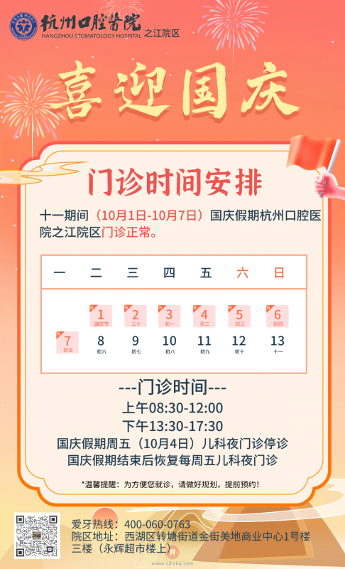杭州口腔医院之江院区节假日门诊上班时间(以国庆为例) 杭城看牙记 • 2024年10月4日 10:53 • 杭州看牙动态 十一期间(10月1日-10月7日)国庆假期杭州口腔医院之江院区门诊正常。 门诊时间上午08:30-12:00下午13:30-17:30 国庆假期周五(10月4日)儿科夜门诊停诊 国庆假期结束后恢复每周五儿科夜门诊 *温馨提醒:为方便您就诊,请做好规划,提前预约! 本文内容源自网络仅供参考,不作为诊断医疗依据,更多查询请 → 在线咨询客服
