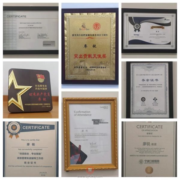 从业多年来,廖医生从未停止过对种植技术的学习。一份份奖章与证书都是她一路走来实力的证明。