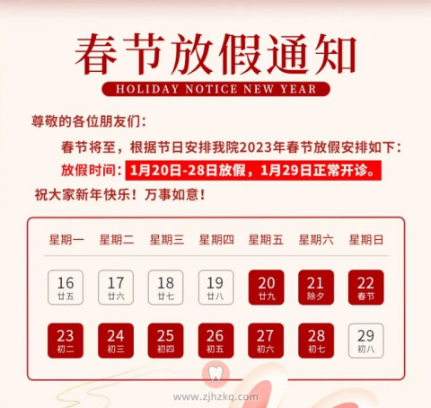 浙江中医药**2023年春节放假及门诊安排 杭城看牙记 • 2023年1月19日 10:38 • 杭州看牙动态 浙中医大口腔医院《春节放假通知》 来源:浙中医大** 本文内容源自网络仅供参考,不作为诊断医疗依据,更多查询请 → 在线咨询客服