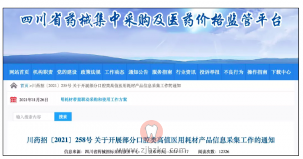 11月中旬,四川省药械集采平台发布《川药招〔2021〕258号关于开展部分口腔类高值医用耗材产品信息采集工作的通知》,开展口腔种植体、修复基台、种植修复配件等产品的信息申报工作,目前申报已截止。