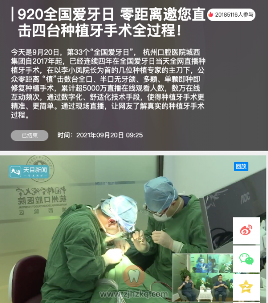2021年9月20日上午8:30,杭州口腔医院城西院区携手新浪浙江、天目新闻等媒体联袂巨献大型种植牙手术直播活动:种植牙手术四台联播,携千万网友走进手术室,见证牙齿“新”生。