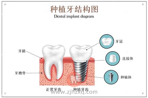 种植牙的结构中的种植体,植入在牙槽骨内,属于人工牙根,植入以后数月,牙根就与骨头长成体,形成骨结合,说明种植体生长成功。上部再装配基台,另外在基台上,再装配牙冠,整个的种植牙就完成了。