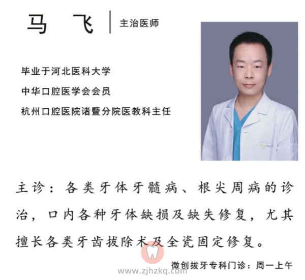 在河北**实习一年毕业后,北方上学,南方工作是来自安徽的马飞医生当年给自己定的计划,所以他顺理成章来到杭州,入职杭州口腔医院,随着杭州口腔医院诸暨分院的开业,马飞医生跟随黄统院长来到诸暨,2013年12月28日,是马飞医生诸暨口腔医院出诊的第一天,从一个初出茅庐的年轻医生一步步成长到如今,一待就是将近3000个日夜。